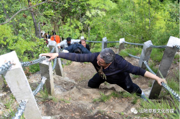 一个个都在谨慎地攀崖走壁,而儒军团队却不忘攻坚使命,认真导游着联盟村的红色文化: